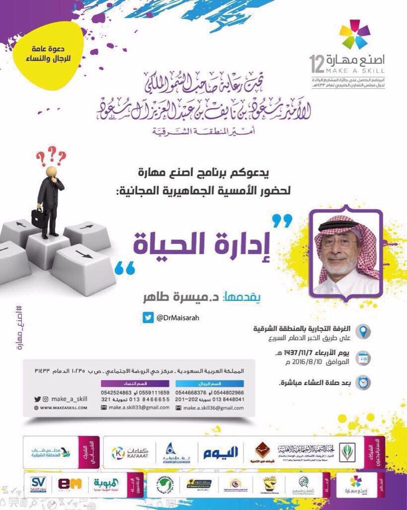 مدينة الخبر On Twitter الليلة أمسية مفتوحة مع الدكتور ميسرة طاهر حول إدارة الحياة بعد صلاة العشاء في غرفة الشرقية ضمن برامج اصنع مهارة