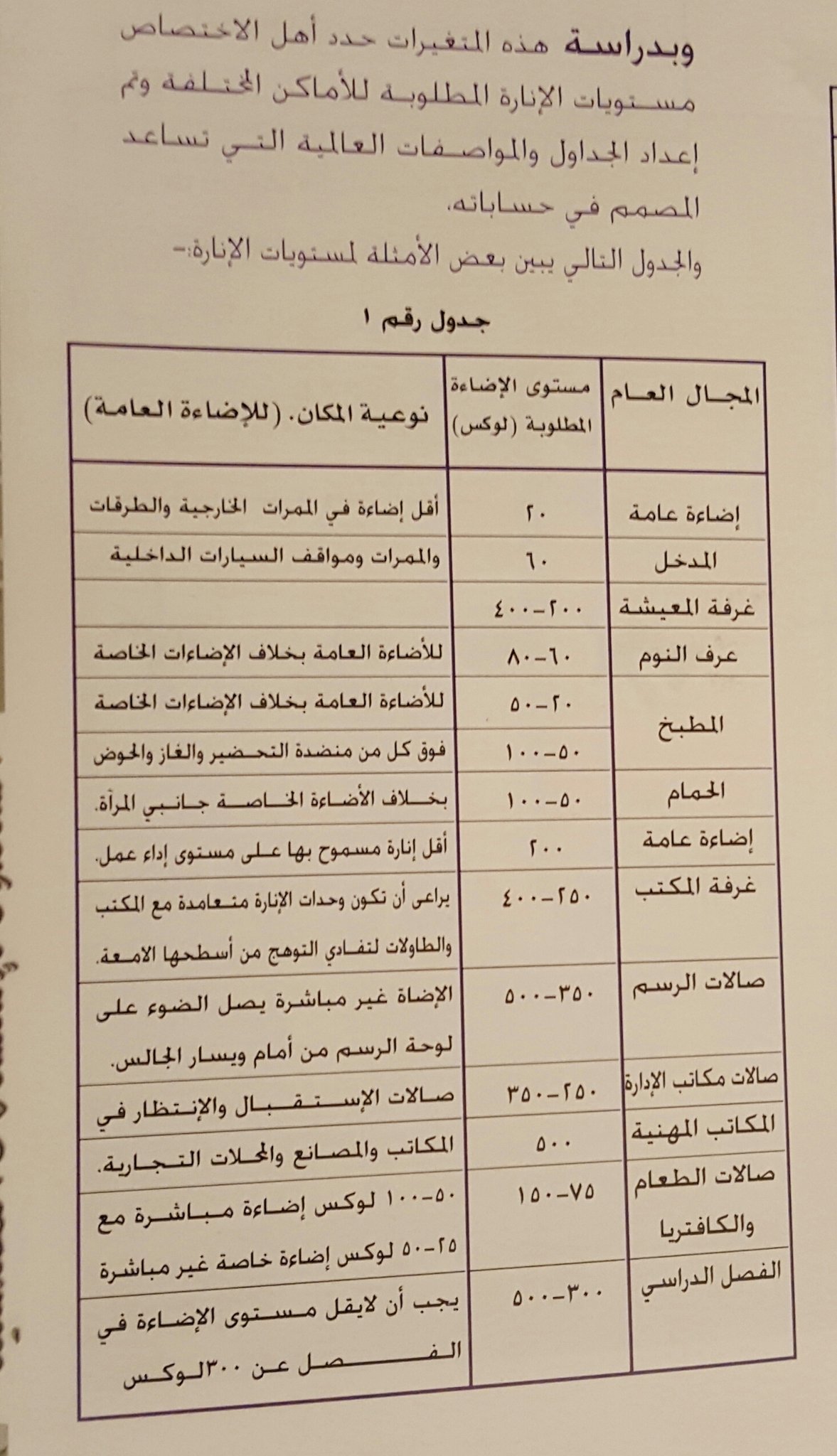 شدة الاضاءة فى الكود المصرى موقع المهندس