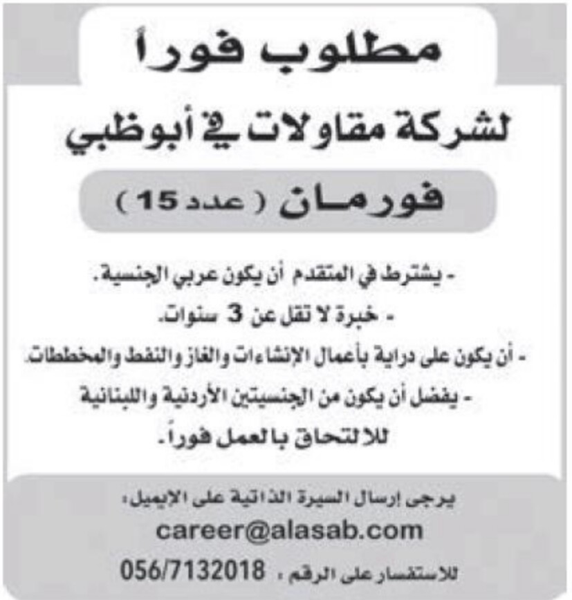 وظائف فى شركة مقاولات فى ابوظبي وظائف شاغرة فى الامارات
