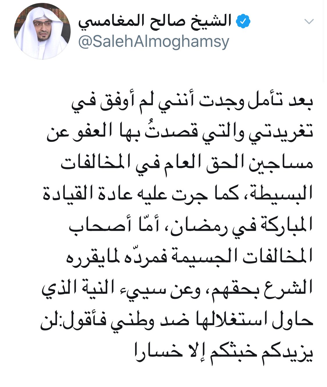معتقلي الرأي Twitter Da عاجل السلطات تقوم بإعفاء صالح المغامسي من إمامة مسجد قباء على خلفية تغريدة طالب فيها بالعفو عن المعتقلين وقد قام المغامسي بحذف التغريدة ونشر تغريدة فيها اعتذار عما