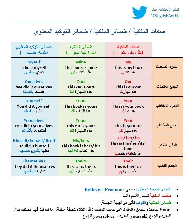 تعل م الإنجليزية معنا On Twitter درس ضمائر الملكية صفات الملكية التوكيد المعنوي Possessive Adjectives Possessive Pronouns Reflexive Pronouns Http T Co Zuzkiy9qbk